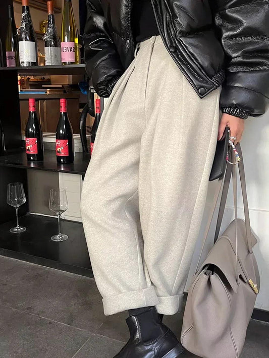 Chic Women Casual Loose Pockets Woolen Suit Pants Autumn Winter High Waist Thicken Korean Ladies Solid Harem Trousers